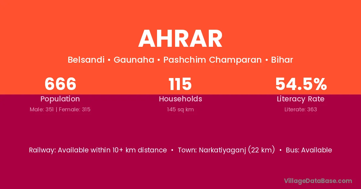 Narkatiyaganj (22 km) is the nearest town to Ahrar village for major economic activities and is located approximately 22 km away.