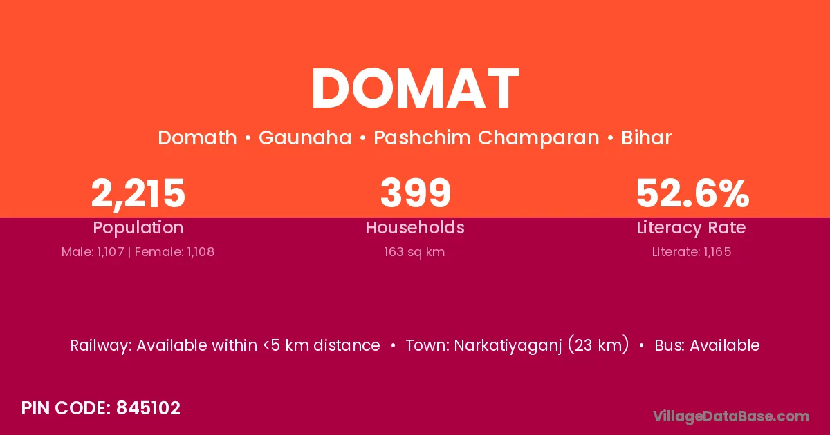 Narkatiyaganj (23 km) is the nearest town to Domat village for major economic activities and is located approximately 23 km away.
