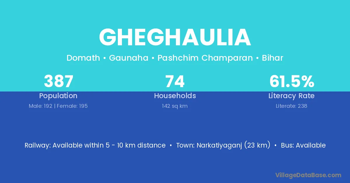 Narkatiyaganj (23 km) is the nearest town to Gheghaulia village for major economic activities and is located approximately 23 km away.