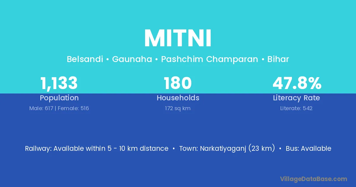 Narkatiyaganj (23 km) is the nearest town to Mitni village for major economic activities and is located approximately 23 km away.