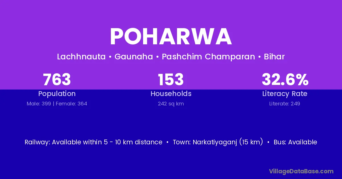 Narkatiyaganj (15 km) is the nearest town to Poharwa village for major economic activities and is located approximately 15 km away.