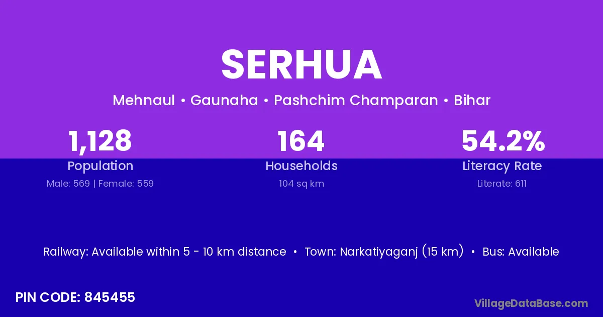 Narkatiyaganj (15 km) is the nearest town to Serhua village for major economic activities and is located approximately 15 km away.