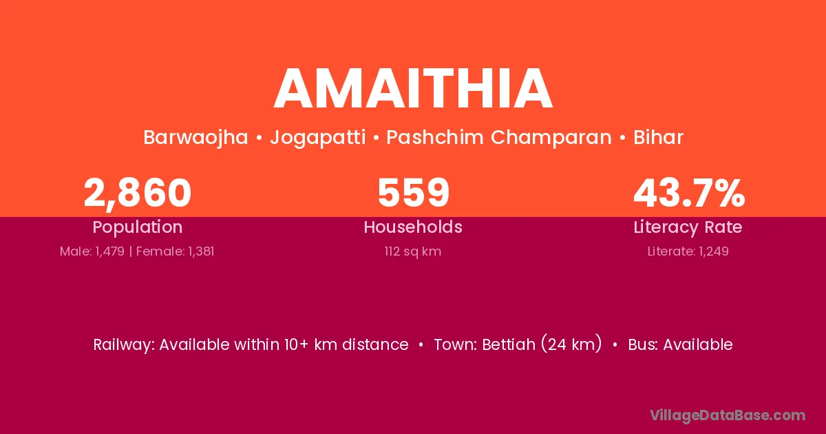 Bettiah (24 km) is the nearest town to Amaithia village for major economic activities and is located approximately 24 km away.