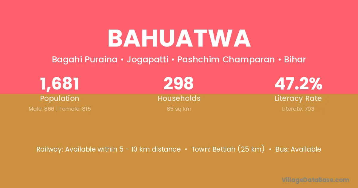 Bettiah (25 km) is the nearest town to Bahuatwa village for major economic activities and is located approximately 25 km away.