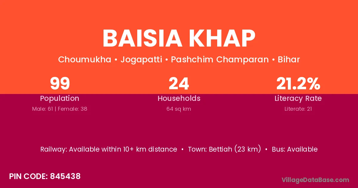 Bettiah (23 km) is the nearest town to Baisia Khap village for major economic activities and is located approximately 23 km away.