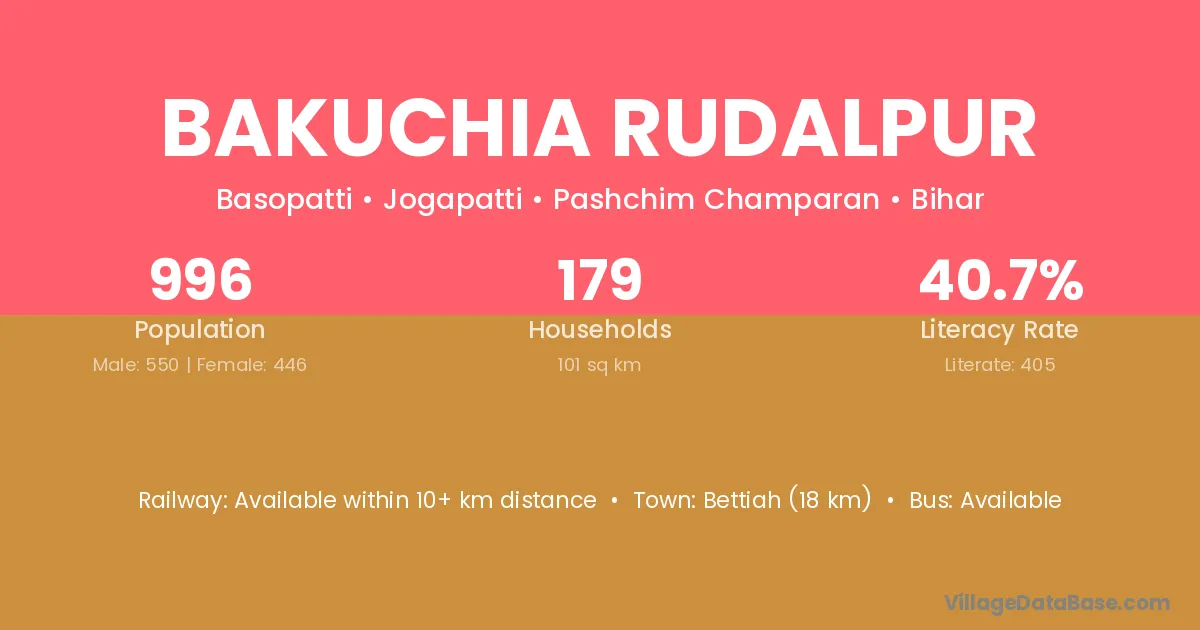 Bakuchia Rudalpur village has a total population of 996 people, of which 550 are males and 446 are females.