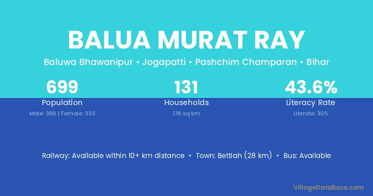 Bettiah (28 km) is the nearest town to Balua Murat Ray village for major economic activities and is located approximately 28 km away.