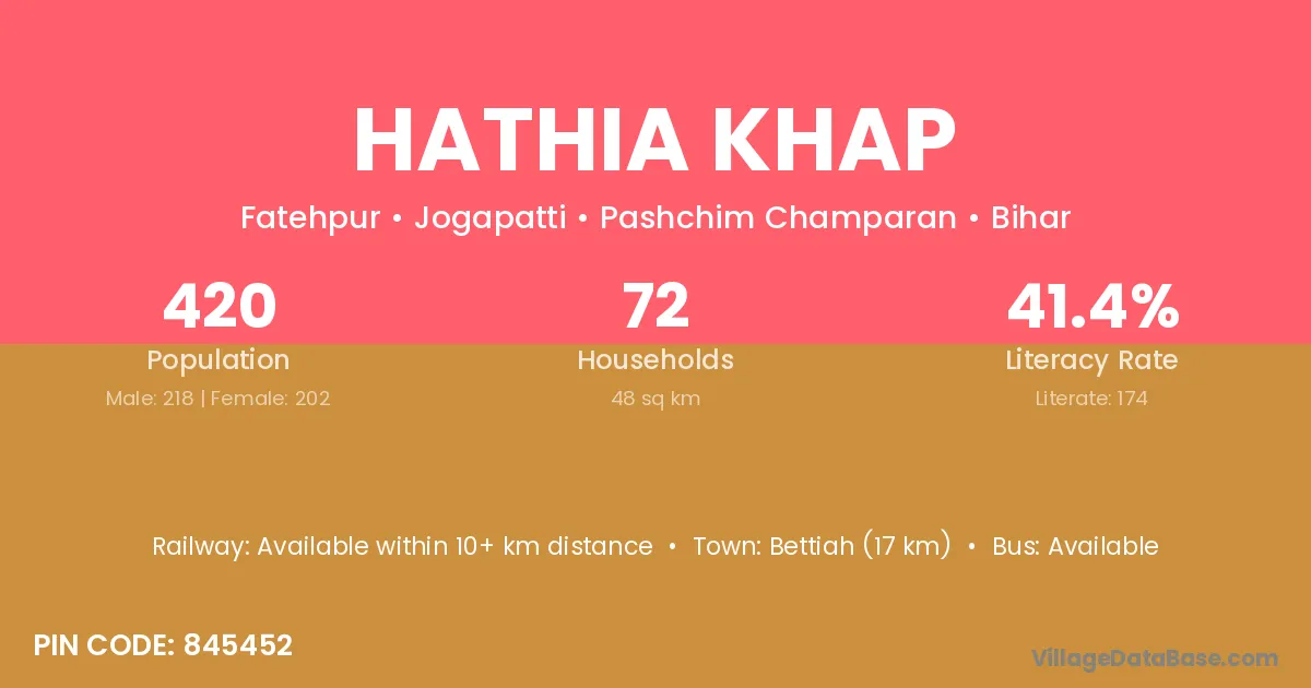 Bettiah (17 km) is the nearest town to Hathia Khap village for major economic activities and is located approximately 17 km away.