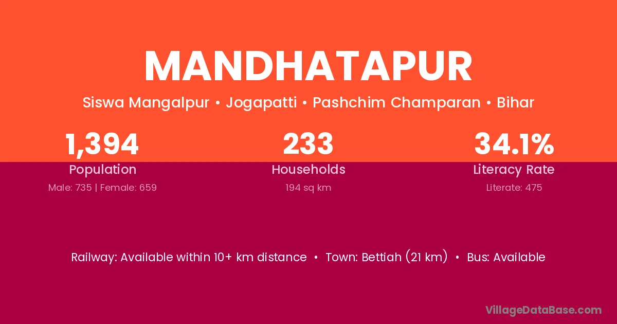 Bettiah (21 km) is the nearest town to Mandhatapur village for major economic activities and is located approximately 21 km away.