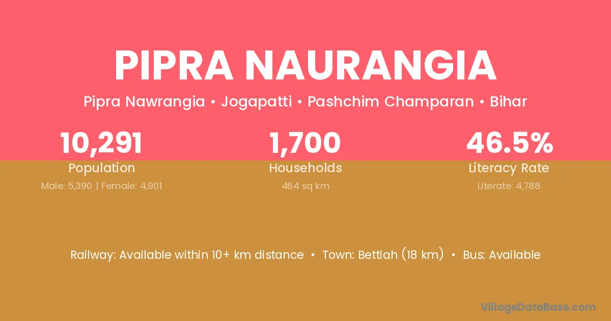 Bettiah (18 km) is the nearest town to Pipra Naurangia village for major economic activities and is located approximately 18 km away.