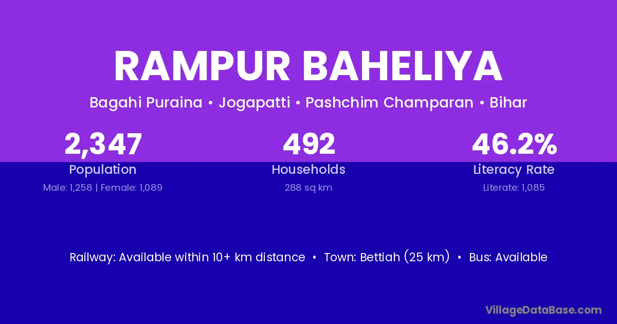 Rampur Baheliya village has a total population of 2,347 people, of which 1,258 are males and 1,089 are females.