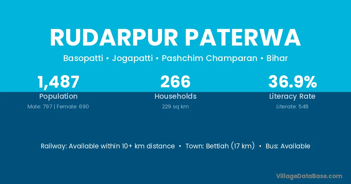 Bettiah (17 km) is the nearest town to Rudarpur Paterwa village for major economic activities and is located approximately 17 km away.