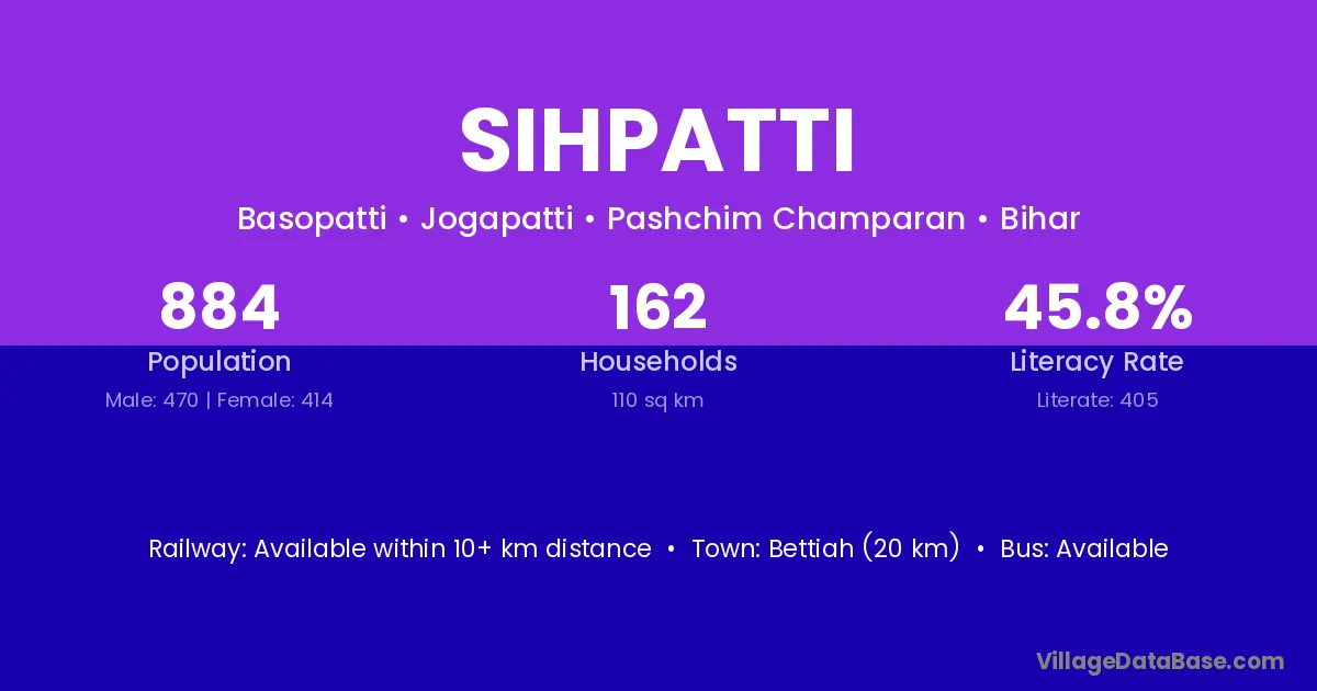 Bettiah (20 km) is the nearest town to Sihpatti village for major economic activities and is located approximately 20 km away.