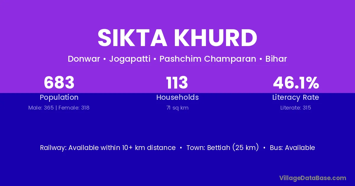 Sikta Khurd village has a total population of 683 people, of which 365 are males and 318 are females.