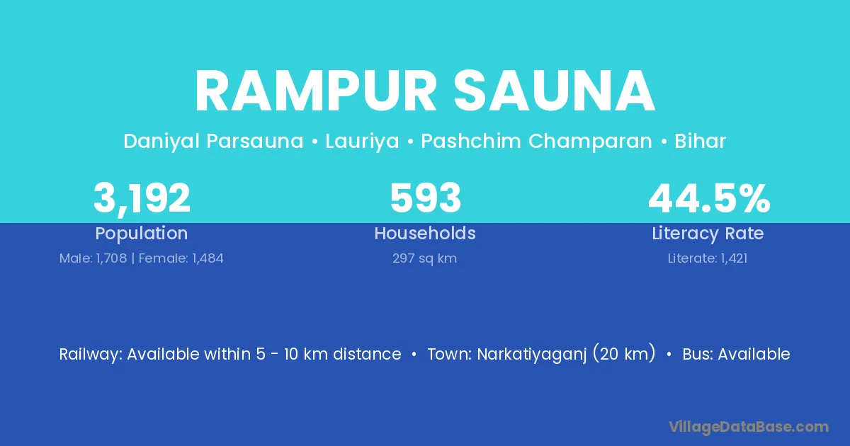 Narkatiyaganj (20 km) is the nearest town to Rampur Sauna village for major economic activities and is located approximately 20 km away.