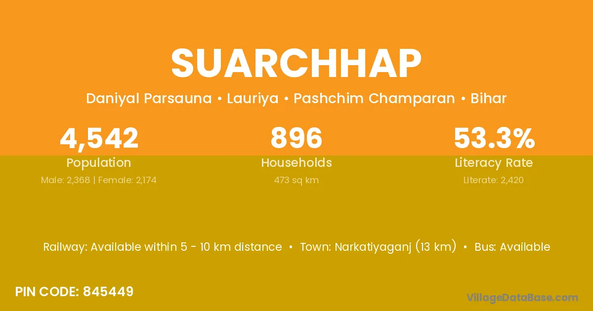 Narkatiyaganj (13 km) is the nearest town to Suarchhap village for major economic activities and is located approximately 13 km away.
