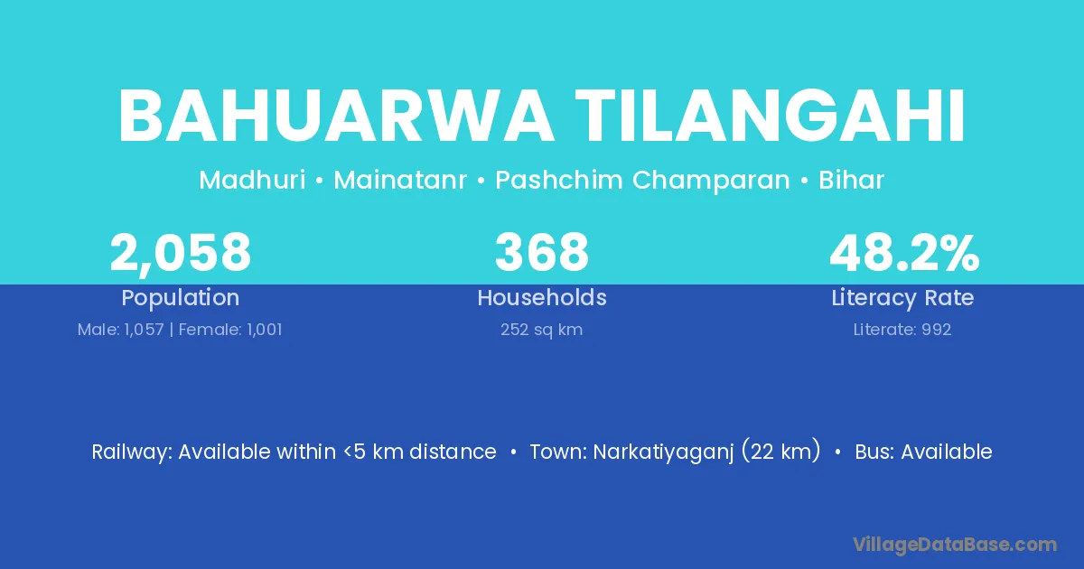 Bahuarwa Tilangahi village has a total population of 2,058 people, of which 1,057 are males and 1,001 are females.