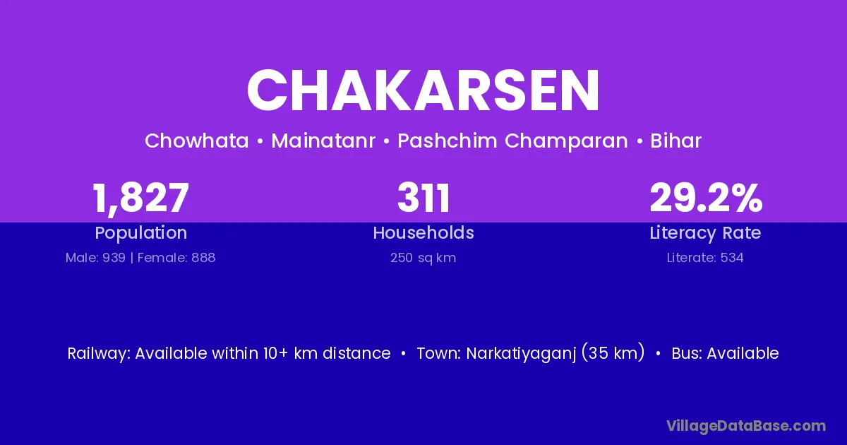 Narkatiyaganj (35 km) is the nearest town to Chakarsen village for major economic activities and is located approximately 35 km away.