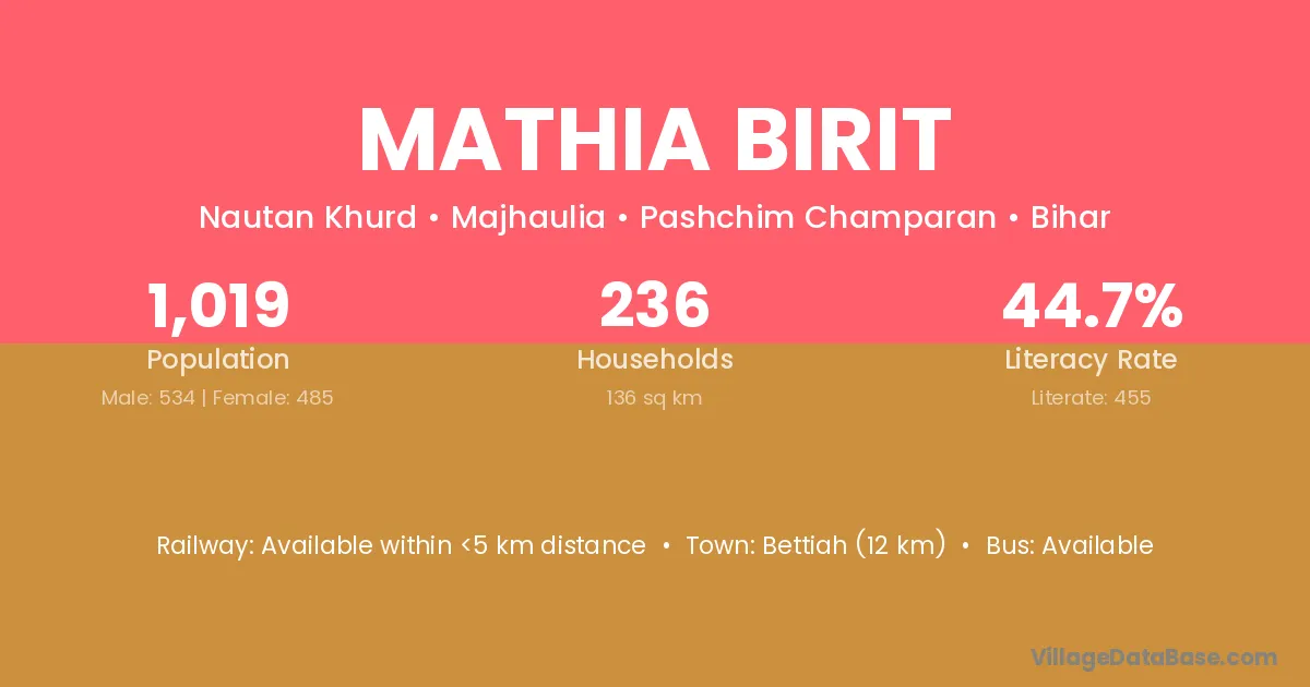 Bettiah (12 km) is the nearest town to Mathia Birit village for major economic activities and is located approximately 12 km away.