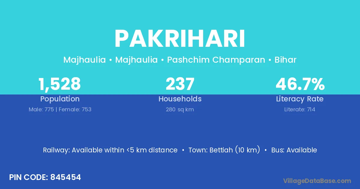 Bettiah (10 km) is the nearest town to Pakrihari village for major economic activities and is located approximately 10 km away.