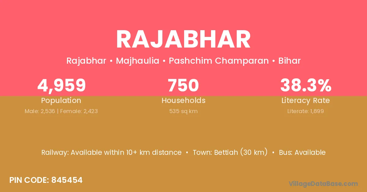 Bettiah (30 km) is the nearest town to Rajabhar village for major economic activities and is located approximately 30 km away.