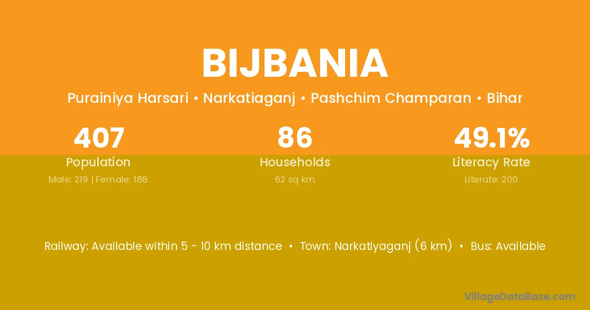 Narkatiyaganj (6 km) is the nearest town to Bijbania village for major economic activities and is located approximately 6 km away.
