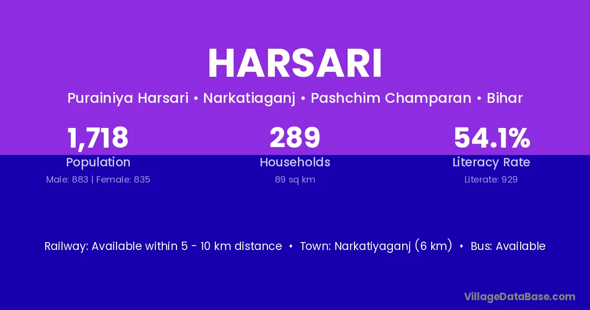 Narkatiyaganj (6 km) is the nearest town to Harsari village for major economic activities and is located approximately 6 km away.
