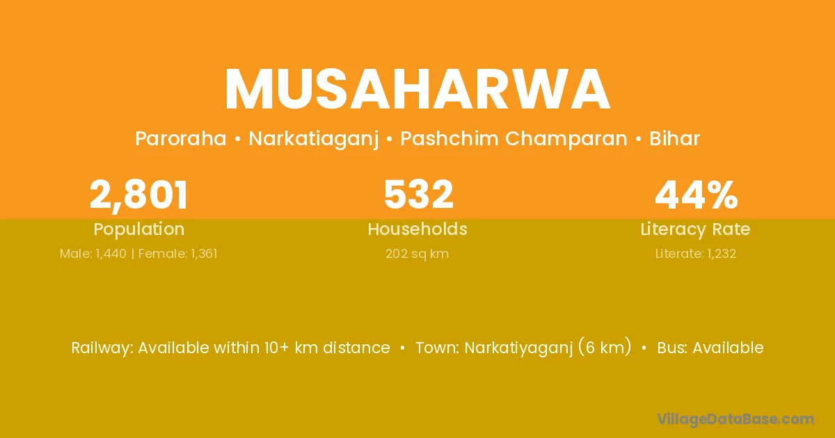 Narkatiyaganj (6 km) is the nearest town to Musaharwa village for major economic activities and is located approximately 6 km away.