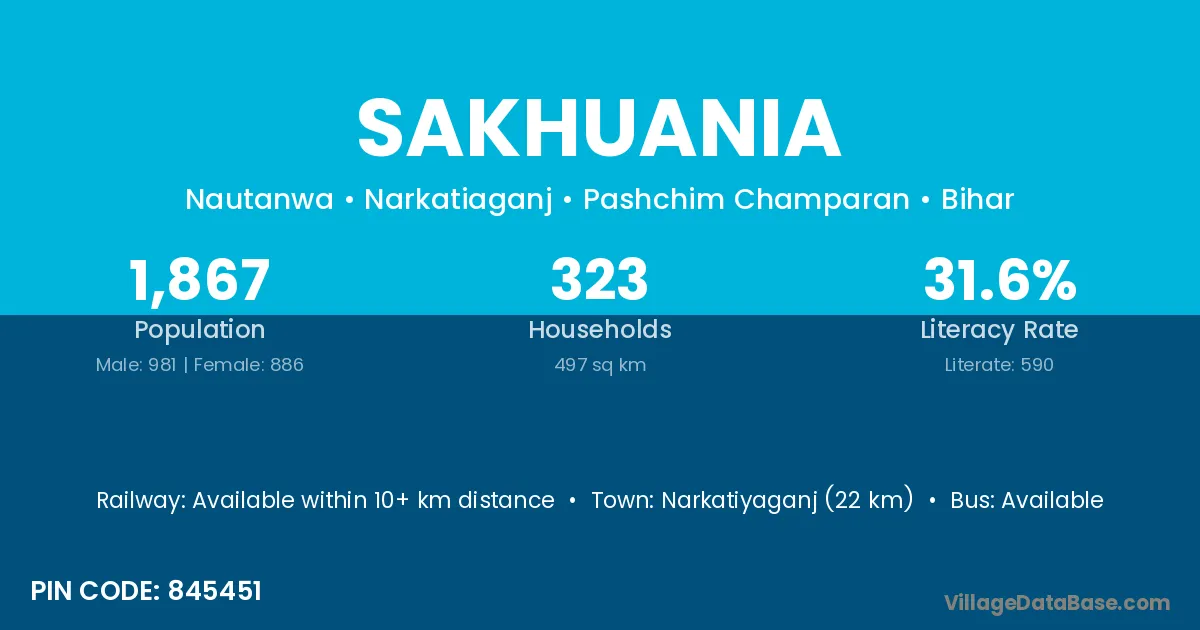 Narkatiyaganj (22 km) is the nearest town to Sakhuania village for major economic activities and is located approximately 22 km away.