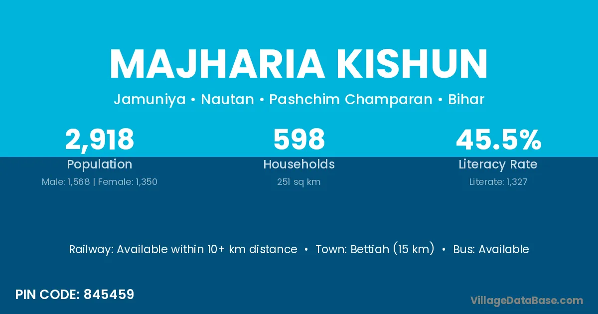 Bettiah (15 km) is the nearest town to Majharia Kishun village for major economic activities and is located approximately 15 km away.