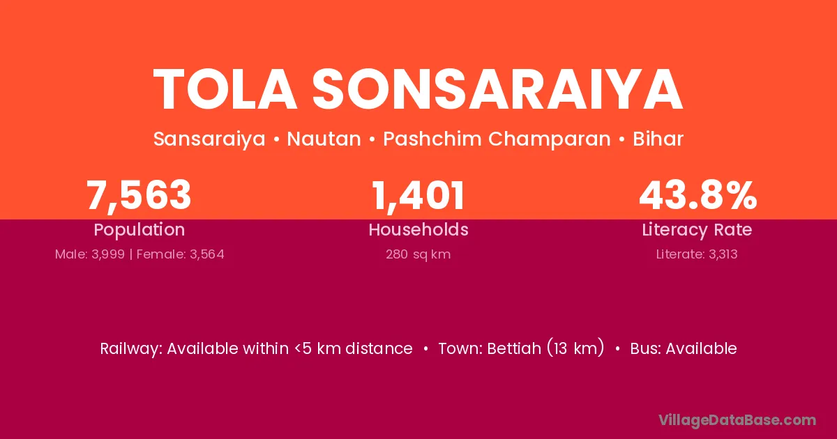 Bettiah (13 km) is the nearest town to Tola Sonsaraiya village for major economic activities and is located approximately 13 km away.