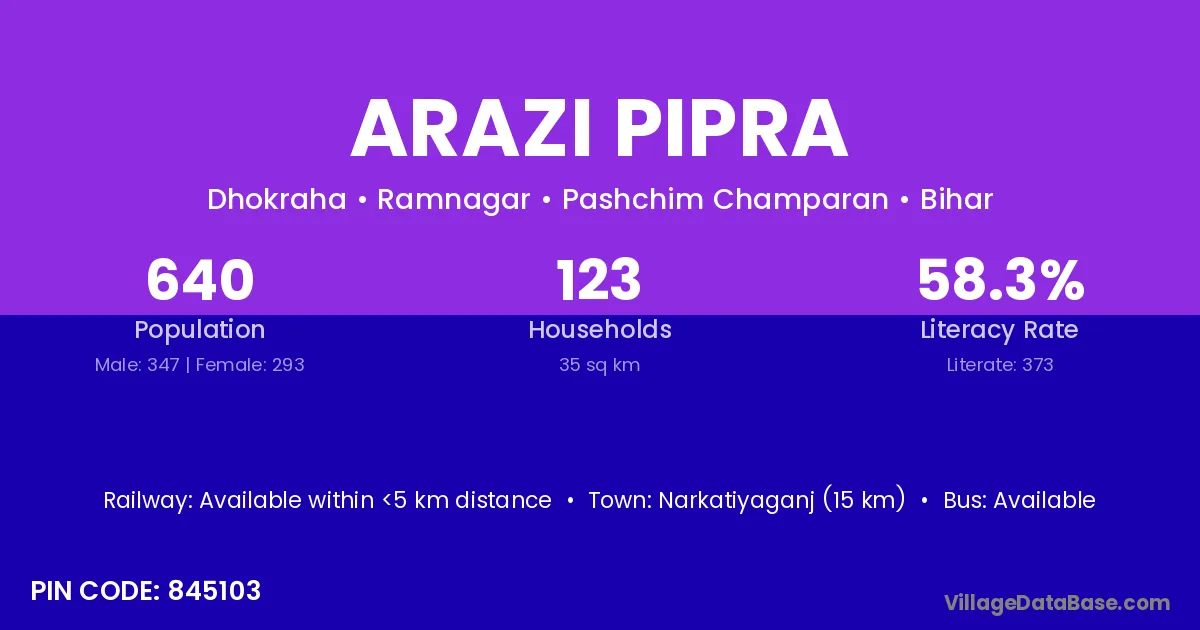 Narkatiyaganj (15 km) is the nearest town to Arazi Pipra village for major economic activities and is located approximately 15 km away.
