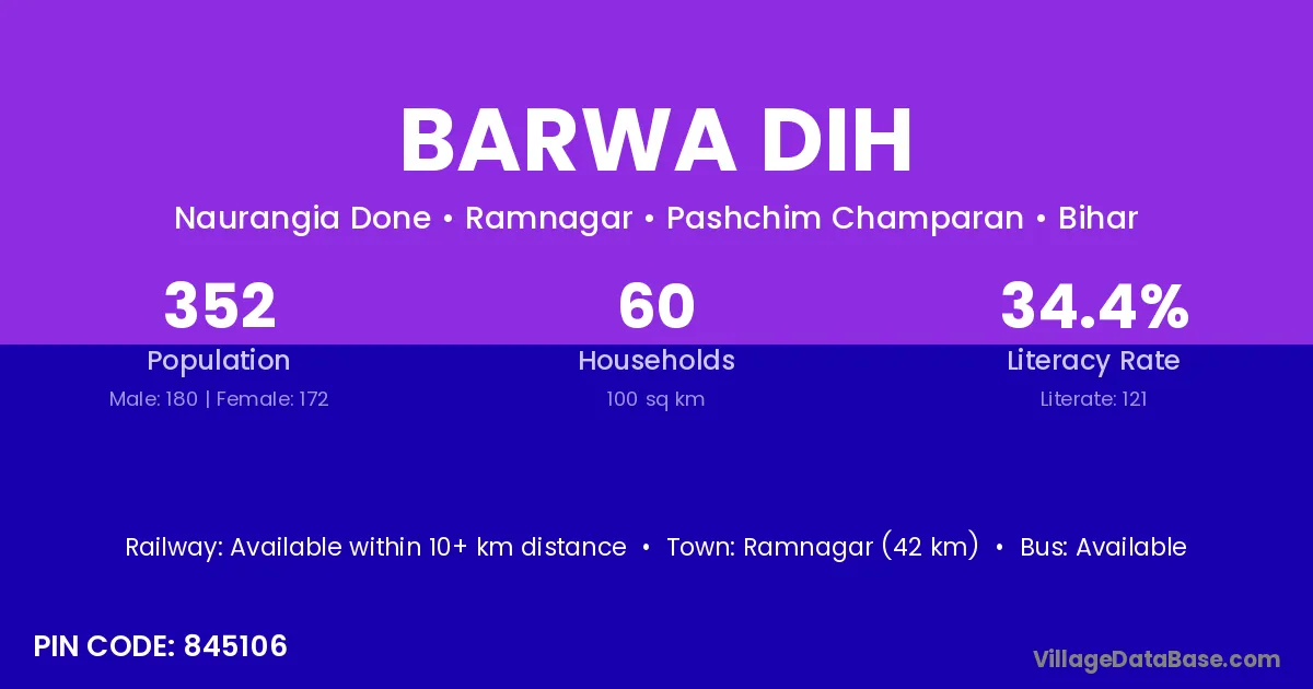 Ramnagar (42 km) is the nearest town to Barwa Dih village for major economic activities and is located approximately 42 km away.