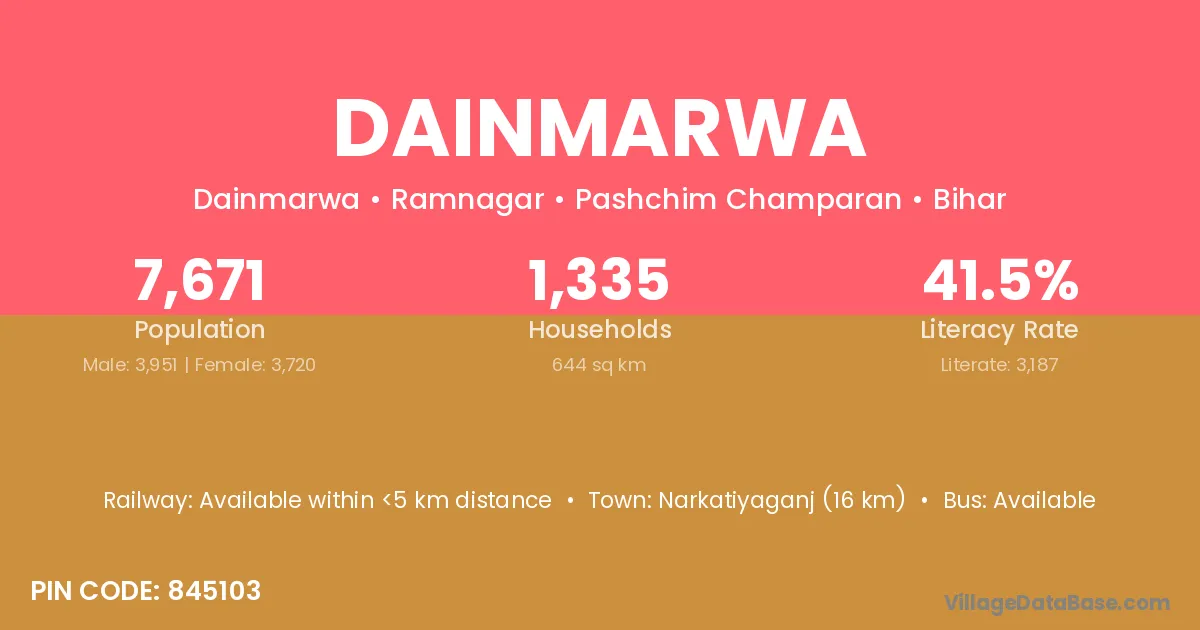 Narkatiyaganj (16 km) is the nearest town to Dainmarwa village for major economic activities and is located approximately 16 km away.