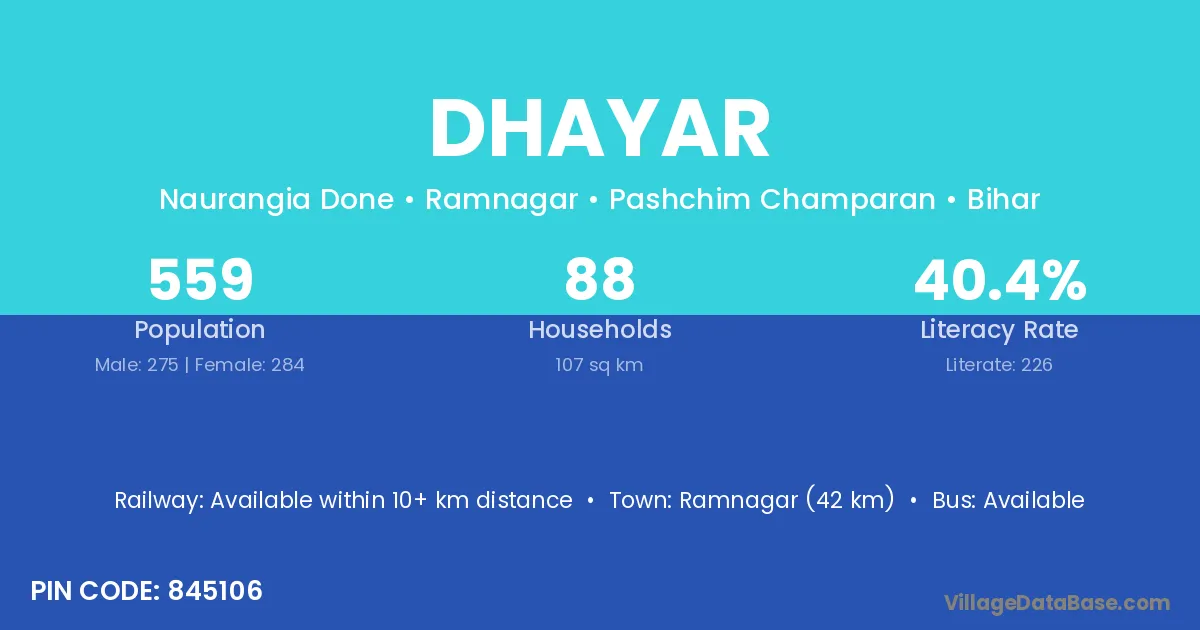 Dhayar village has a total population of 559 people, of which 275 are males and 284 are females.