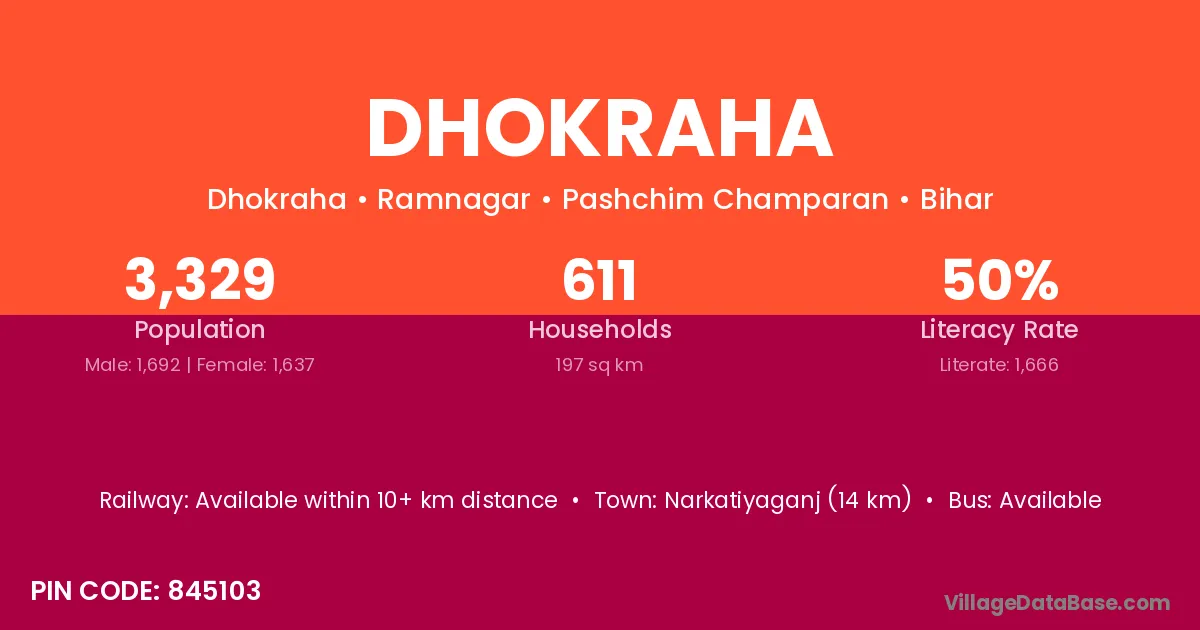 Narkatiyaganj (14 km) is the nearest town to Dhokraha village for major economic activities and is located approximately 14 km away.