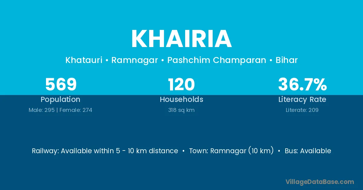 Ramnagar (10 km) is the nearest town to Khairia village for major economic activities and is located approximately 10 km away.
