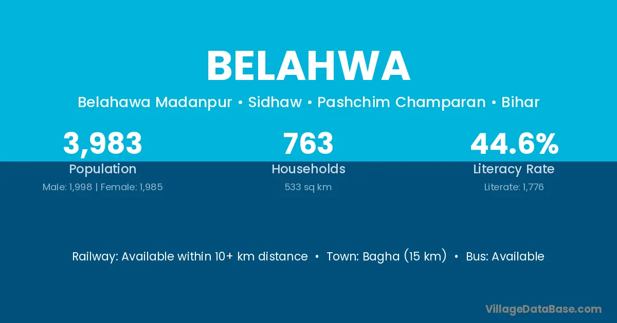 Bagha (15 km) is the nearest town to Belahwa village for major economic activities and is located approximately 15 km away.
