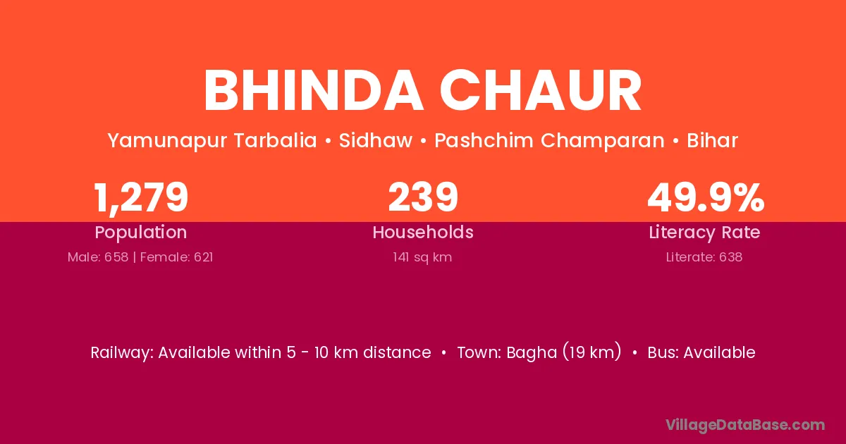 Bhinda Chaur village has a total population of 1,279 people, of which 658 are males and 621 are females.