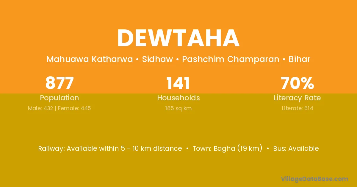 Bagha (19 km) is the nearest town to Dewtaha village for major economic activities and is located approximately 19 km away.