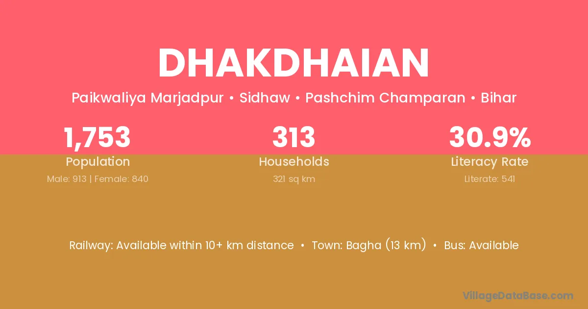 Bagha (13 km) is the nearest town to Dhakdhaian village for major economic activities and is located approximately 13 km away.