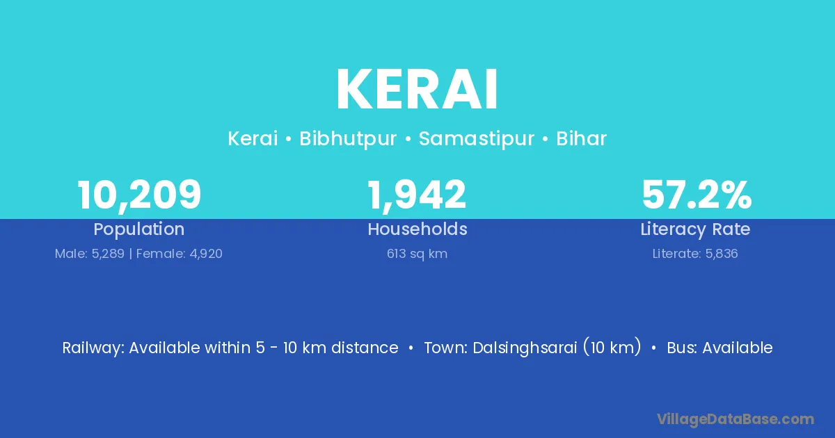 The literacy rate of Kerai village is 56.31%. Male literacy stands at 59.96% and female literacy at 52.84%.