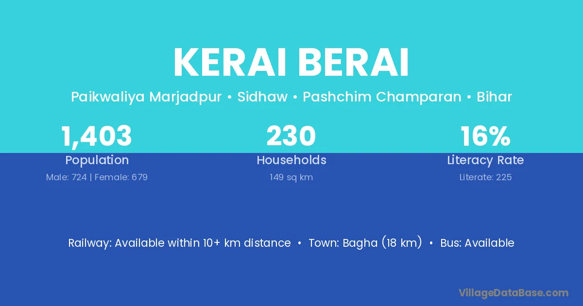 Bagha (18 km) is the nearest town to Kerai Berai village for major economic activities and is located approximately 18 km away.