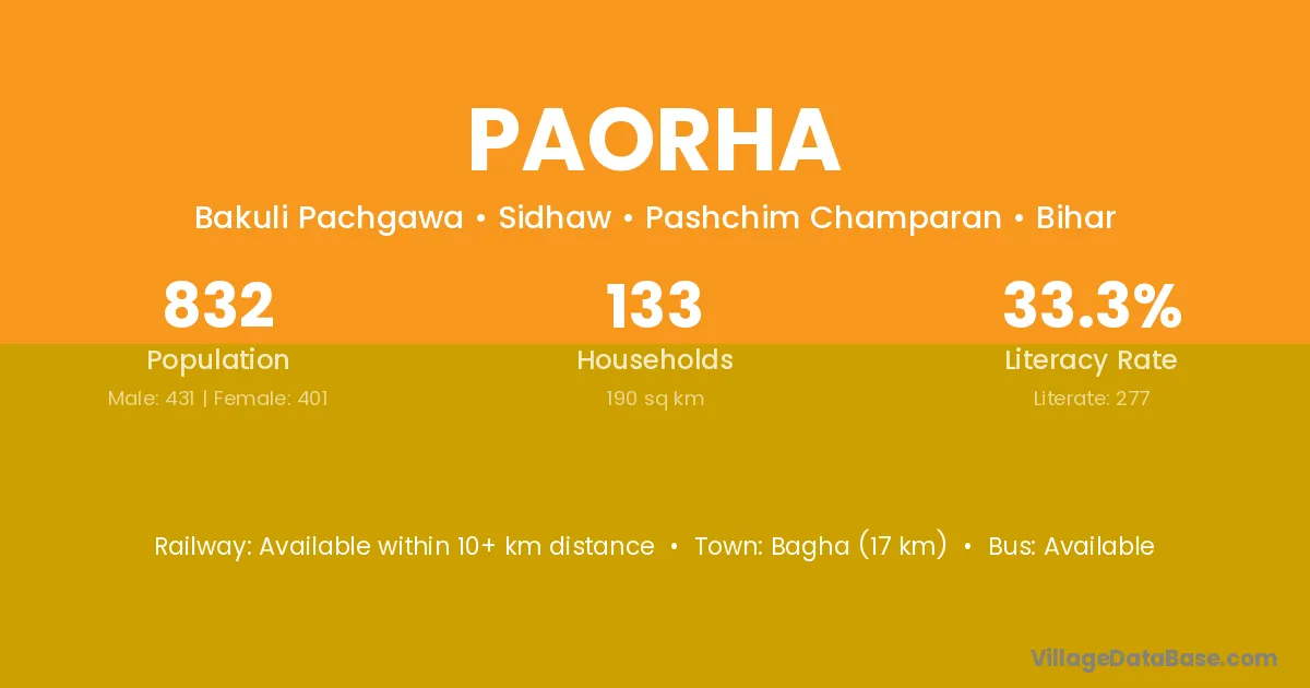 Bagha (17 km) is the nearest town to Paorha village for major economic activities and is located approximately 17 km away.