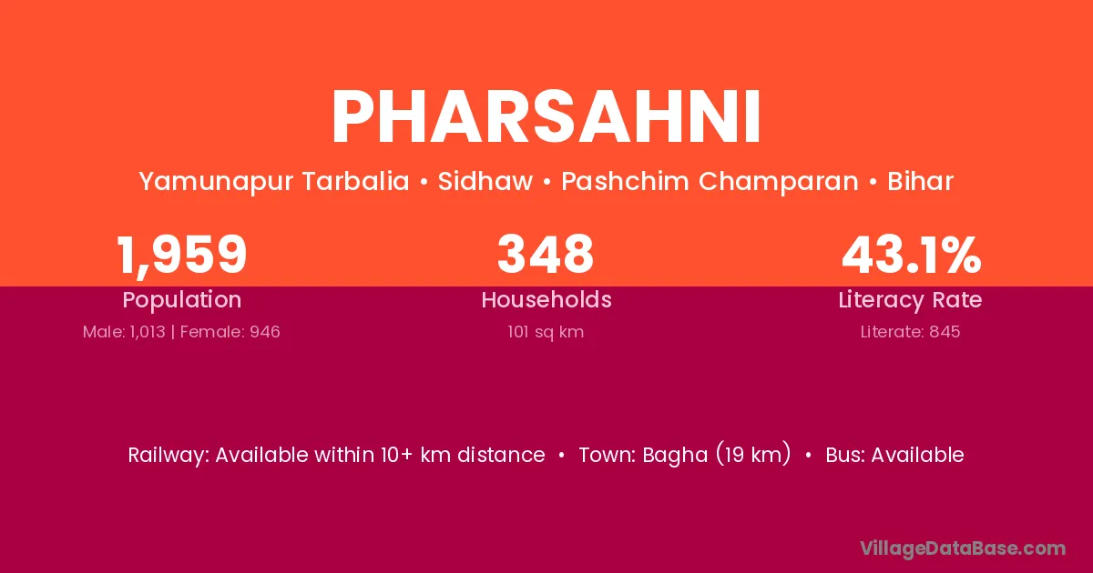 Bagha (19 km) is the nearest town to Pharsahni village for major economic activities and is located approximately 19 km away.