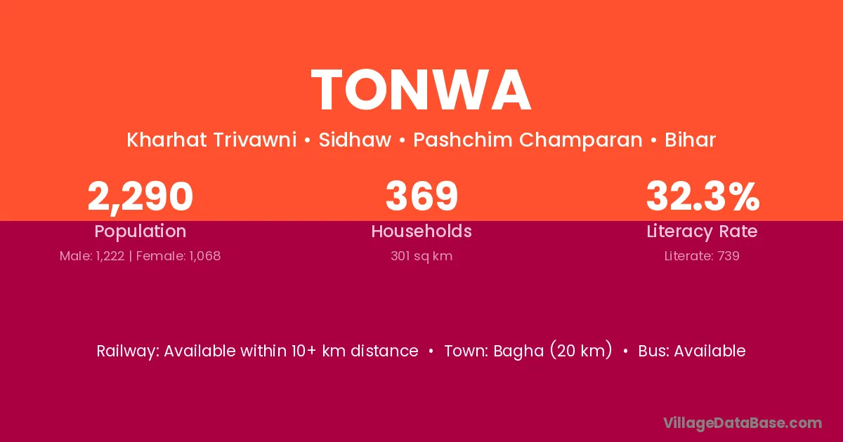 Bagha (20 km) is the nearest town to Tonwa village for major economic activities and is located approximately 20 km away.