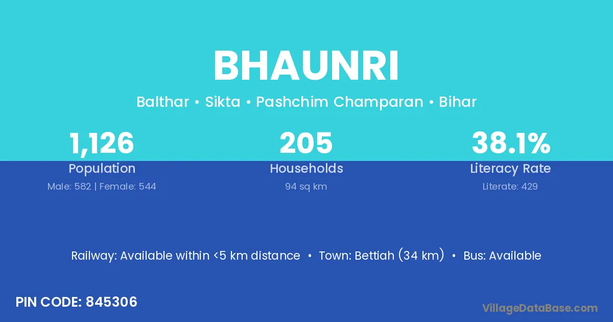 Bettiah (34 km) is the nearest town to Bhaunri village for major economic activities and is located approximately 34 km away.