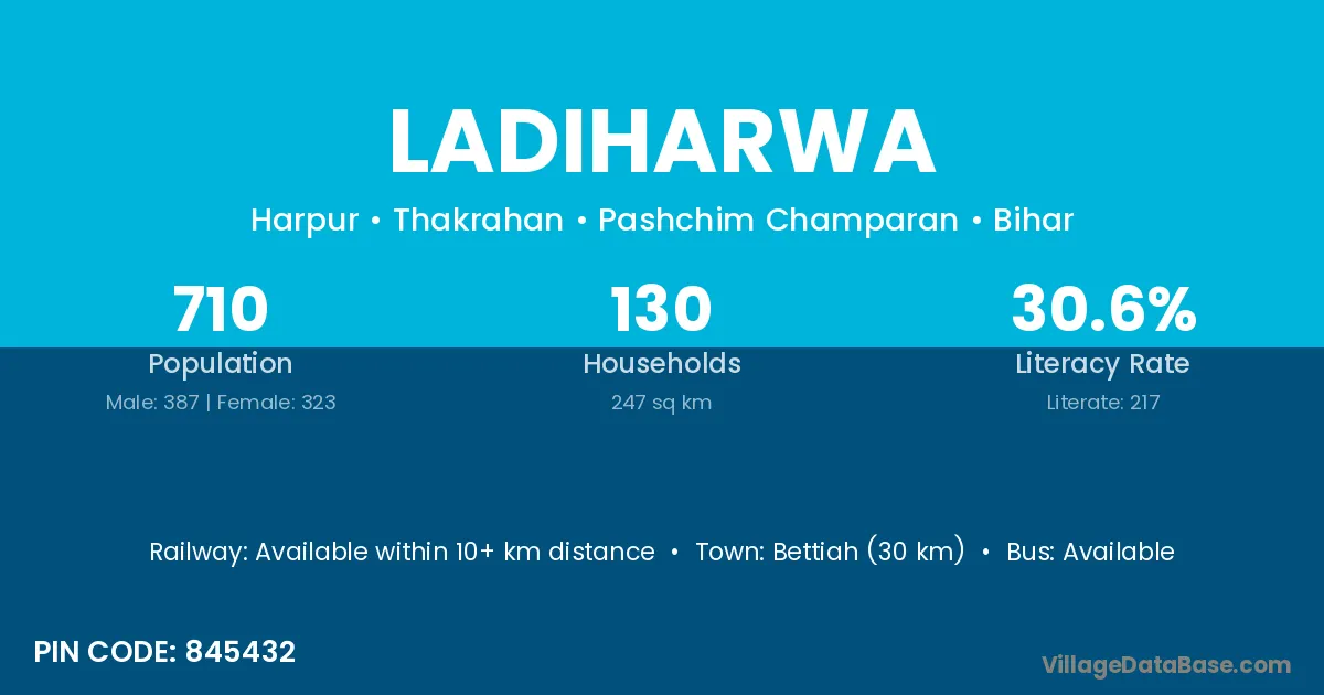Bettiah (30 km) is the nearest town to Ladiharwa village for major economic activities and is located approximately 30 km away.
