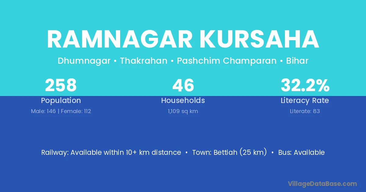 Ramnagar Kursaha village has a total population of 258 people, of which 146 are males and 112 are females.