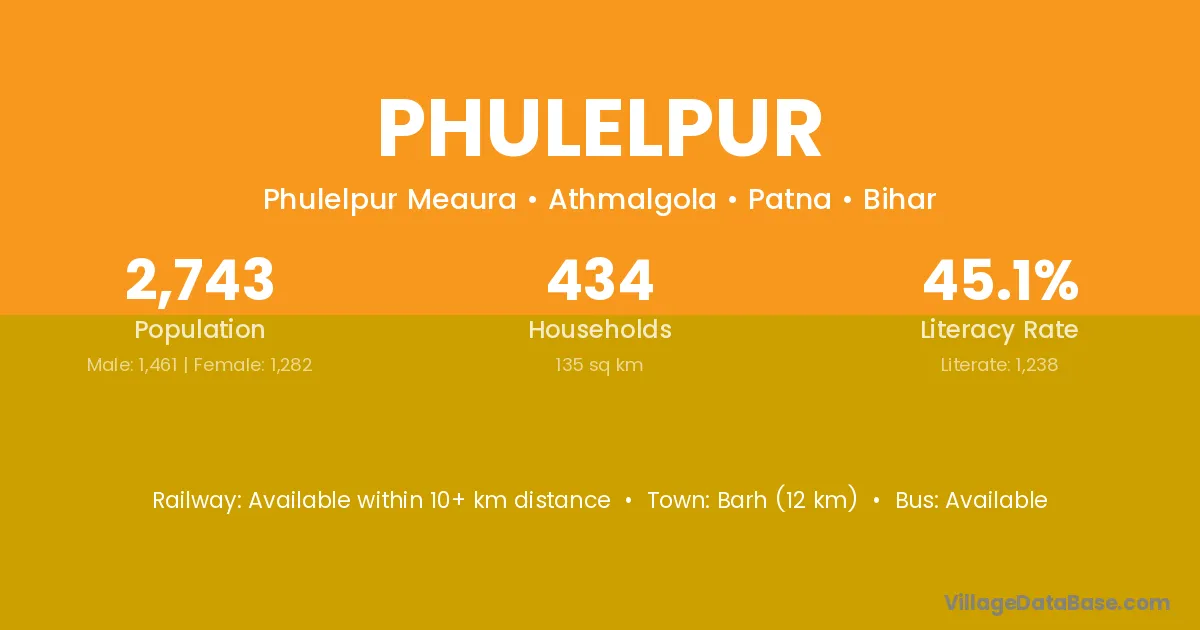 Barh (12 km) is the nearest town to Phulelpur village for major economic activities and is located approximately 12 km away.